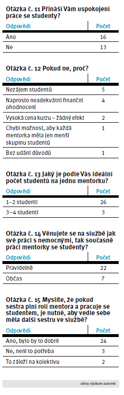 Na otázku, z jakých zdrojů byl hrazen mentorský kurz, odpovědělo 21 respondentek (72 %), že si hradily mentorský kurz samy, 2 (7 %) absolvovaly mentorský kurz bezplatně a jedné respondentce (3 %) byl hrazen z jiných zdrojů. Na otázku „Jak vnímáte vzájemnou spolupráci s kolegyněmi, které nejsou v roli mentora?“ uvedla většina respondentek – 18 (62 %), že spolupráce s kolegyněmi je dobrá. Velmi dobrou spolupráci uvádí 9 dotazovaných (31 %) a špatnou pouze 2 dotazované (7 %). Obecné vnímání sester mentorek ostatními sestrami na odděleních –podle 21 respondentek (72 %) z celkového počtu 29 jsou vnímány neutrálně. Pozitivně vnímány jsou pouze ve 4 případech (14 %). Stejně je tomu u odpovědí „jak kdy“ – 4 respondentky (14 %). Na otázku možných konfliktů mezi sestrami mentorkami a jejich kolegyněmi nementorkami uvádí většina, tj. 23 respondentek, že ke konfliktům nedochází. Čtyři respondentky spatřují možný konflikt v koordinaci a předávání kompetencí a 2 respondentky vidí příčinu konfliktů v odmítání jakékoliv odpovědnosti za práci se studenty. Na otázku, zda jim práce se studenty přináší uspokojení, odpovědělo 16 respondentek (55 %), že ano, a 13 (45 %), že nikoliv. Z celkového počtu 13 respondentek, které na předchozí otázku odpověděly záporně, jich 5 vidí problém v nezájmu studentů, 4 respondentky v naprosto neadekvátním finančním ohodnocení, 2 respondentky jsou přesvědčeny o vysoké ceně jejich kurzu bez následného efektu a jedna respondentka vidí problém v množství studentů na jednoho mentora. Jedna respondentka se k této skutečnosti nevyjádřila. Na dotaz „Věnujete se na službě jak své práci s nemocnými, tak současně práci mentorky?“ odpovědělo 22 (76 %), že je tomu tak pravidelně.