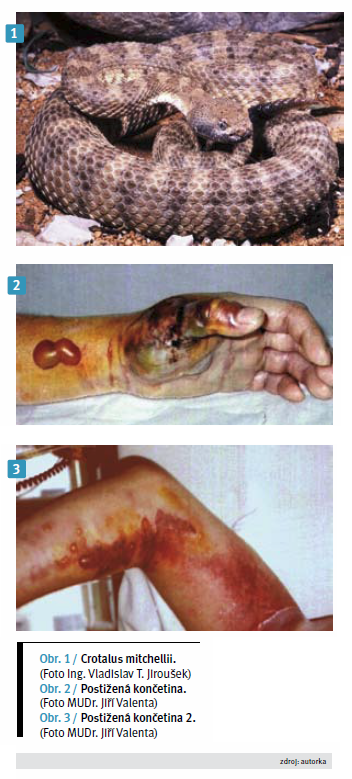 Summary: Poisonous snakes live in the wild in the vast majority of the Earth. Constitute about 10–20 % of species of snakes. Occupy a unique position in the human psyche, to which perhaps partly relates the popularity of their capture and breed. There are also those, who get the snake with the only information, that the snake is very dangerous to deadly. The aim of this article is to bring the issue of snakebite. Become familiar with snake venoms, their distribution by the effect and symptoms of intoxication, snake antisera, prevention, first aid and treatment of snakebites. In conclusion, I would like to present the case and nursing care of the patient intoxicated by speckled rattlesnake venom (Crotalus mitchellii).