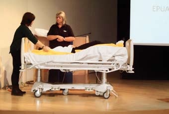 Velmi zajímavý byl workshop společnosti Linet, spol. s r. o., s názvem Moving and handling. V něm nám klinická specialistka Loraine Demott předvedla možnosti, jaké moderní lůžka nabízejí, a upozornila, že personál často všechny tyto možnosti nevyužívá. Nejenže se tak sám namáhá, ale při nevhodné manipulaci může pacientovi způsobit poranění (střihový efekt, odřeniny, zhmoždění). Zprvu jsme nechápaly, co může být na předvedení postupu polohování pacienta pomocí slide sheet tak zázračného, ale když nám s pomocí dobrovolnice předvedla, jak snadno se pacient na lůžku posouvá, nezbylo nám než se zeptat, kde je tato pomůcka k dostání. Také laterální náklon lůžka tak, aby se pacient z polosedu sám postavil, je velkou pomocí nejen pro pacienta, ale i pro ošetřovatelský personál.