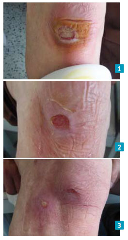 Pacient z ambulance chronických ran, s diabetem 1. typu na inzulinoterapii. Vzhledem k progresi diabetické gangrény mu byla provedena amputace pravé dolní končetiny v bérci v lednu 2012. Hojení pahýlu bylo bez komplikací, rána se zhojila per primam. Pacient byl následně přeložen na rehabilitační lůžko, kde pokračoval v rehabilitaci o jedné končetině a následně mu byla vyrobena protéza. Dále byl bez potíží, pouze dispenzarizován. Nyní však dva roky po amputaci přichází do ambulance pro nehojící se ránu na pahýlu pod kolenem. Dle pacienta se na pahýlu nejprve vytvořil puchýř, který praskl, rána se zvětšovala. Sám si na to doma aplikoval asi 14 dní antiseptické krytí, ale bez efektu léčby. Při objektivním vyšetření se jedná o ránu pod kolenem, velikosti 4 × 3 cm s povleklou spodinou, středně secernující, okraje s mírnou hyperkeratózou a se zarudnutím v okolí. Indurace, retence či fluktuace nebyla přítomna (obr. 1). V rámci ošetření byl na ránu přiložen obklad s oplachovým roztokem na 15 minut a následně byl přiložen Hydrofiber® se stříbrem a pěnou (Aquacel® Ag Foam). Pacient si dále převazoval ránu sám v domácím prostředí, a to v intervalu jednou za tři dny. Byla mu doporučena režimová opatření a zákaz nasazování protézy. Další kontrola byla za 14 dní. Pacient přiznal, že protézu nosil i přes zákaz dále. Udával zmírnění bolesti rány v protéze a snadné ošetřování. Rána byla granulující čistá, bez známek infekce (obr. 2). Proto jsme pokračovali v zavedené terapii a protéza byla ve spolupráci s protetikem upravena tak, aby se odlehčilo místo tlaku na ránu. Pacient nebyl imobilizován, nadále nosil protézu a rána se zhojila za 6 týdnů bez komplikací. Bohužel, při poslední kontrole se ukázalo, že se tvoří nový drobný defekt stejné etiologie – otlaku, laterálně od zhojené rány (obr. 3). Bude tedy nutná kompletní úprava protézy. Nově vzniklá rána je nadále léčena výše uvedeným krytím.