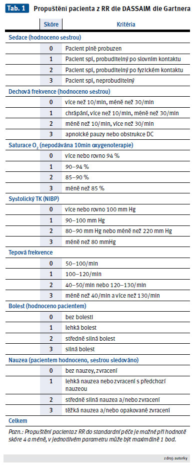 Propuštění pacientů z dospávacího pokoje se děje na základě jasně stanovených kritérií. Tato kritéria musejí charakterizovat stav pacientových fyziologických funkcí s ohledem na výskyt nežádoucích komplikací. Na našem dospávacím pokoji pracujeme dle klinického protokolu, který definuje péči v bezprostředním pooperačním období. O pacienty pečuje sestra specialistka s praxí na resuscitačním oddělení, která každoročně absolvuje teoretický i praktický výcvik k řešení vzniklých komplikací a možnosti propuštění pacienta z dospávacího pokoje. V případě, že pacient nesplňuje kritéria pro propuštění, je přivolán lékař. Pro optimalizaci procesu propouštění pacientů z dospávacího pokoje s ohledem na faktor věku a operační zákrok je používán postanestetický skórovací systém, který byl navržen Dánskou společností pro anesteziologii a resuscitační péči – DASSAIM skóre dle Gartnera (tab. 1). Hodnotí systolický tlak, dechovou a tepovou frekvenci, saturaci krve kyslíkem, průchodnost dýchacích cest, přítomnost bolesti a nauzey. V případě, že pacient nepřevýší výsledné skóre 4, lze jej z dospávacího pokoje propustit.
