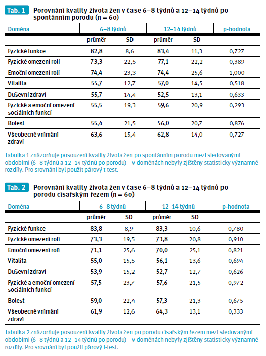 Tabulka 1 ukazuje porovnání kvality života žen v jednotlivých souborech, tedy skupinu žen po spontánním porodu ve sledovaných obdobích (6–8 týdnů po porodu a 12–14 týdnů po porodu), tabulka 2 ukazuje skupinu žen po císařském řezu, také v obou zmíněných obdobích. Při posuzování kvality života žen po spontánním porodu nebyly mezi sledovanými obdobími zjištěny statisticky významné rozdíly v žádné z domén. Pro srovnání byl použit párový t-test.