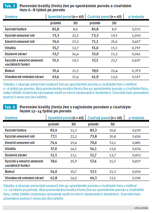 Tabulka 4 ukazuje porovnání souborů žen po spontánním porodu a císařském řezu v měření 12–14 týdnů po porodu. Byla porovnávána kvalita života žen po spontánním porodu a císařském řezu, nebyl zjištěn statisticky významný rozdíl ve všech sledovaných doménách. Srovnání bylo provedeno pomocí t-testu pro dva výběry.