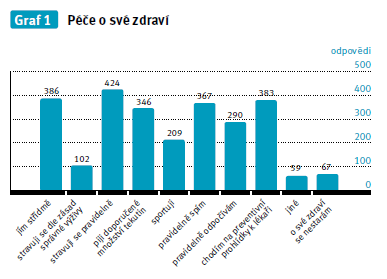 Graf 1 uvádí, jak se respondenti starají o své zdraví. Z celkového počtu dotazovaných Romů byla nejčastější odpovědí pravidelnost ve stravování, která byla zastoupena 424 odpověďmi, další nejčastější odpovědí bylo střídmé stravování v 386 případech a poté preventivní prohlídky u lékaře u 383 dotázaných. Dále udávají Romové jako součást péče o zdraví pravidelnost spánku (367 odpovědí) a také příjem doporučeného množství tekutin (346 odpovědí). Mezi odpověďmi jsme se také setkali s možností, že se o své zdraví nestarají, což bylo v 67 případech.
