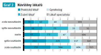 Graf 2 udává výsledky vztahující se k preventivní péči u Romů v rámci návštěvnosti lékařů. Nejvíce navštěvují Romové praktické lékaře jako součást preventivní péče o jejich zdraví, a to v 751 případech z celkového počtu odpovědí. S nárůstem specializovanosti lékařů však lze konstatovat, že jejich návštěvnost klesá; setkáváme se s negativní odpovědí, co se týká prevence u lékařů specialistů oproti praktickým lékařům.