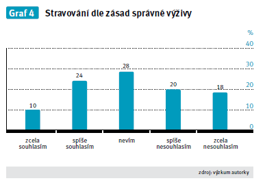 V rámci péče o zdraví je nutné se zaměřit na další faktory ovlivňující zdraví, jako je kouření a užívání kávy či alkoholu. Z celkového počtu dotazovaných 58,33 % Romů kouří. Kouření romské komunity se poté odráží na výskytu kardiovaskulárních onemocnění, což dokazují další výsledky tohoto výzkumu, kdy onemocněním srdce a cév trpí 39 % respondentů oproti dalším šesti uváděným chronickým onemocněním, jako byly například onemocnění plic, zažívacího traktu, krevního systému, onemocnění urogenitální, mozku či svalů. Dalšími faktory ovlivňujícími zdraví jsou pití kávy, jež uvádí 63,53 % dotázaných Romů; co se týká požívání alkoholu, 10,65 % pije alkohol pravidelně, 58,94 % výjimečně a 28,02 % nepije vůbec. Také jsme se zaměřili na zjišťování stravování dle zásad správné výživy. Tyto výsledky udává graf 3, kdy se kladně vyjádřilo 10 % dotázaných respondentů „zcela souhlasím“ a 24 % dotázaných Romů „spíše souhlasím“.