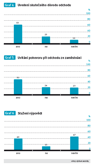 Za pozitivní výsledek této práce považuji zjištění, že respondenti by otevřeně zaměstnavateli sdělili skutečný důvod odchodu i v okamžiku, kdy by daný důvod byl nelichotivý – viz graf č. 4. Management by se měl více snažit vytvořit pozitivní a diskrétní atmosféru, aby vymýtil obavy zaměstnanců a mohl skutečně zjistit pravý důvod odchodu respondentů – a tím zmírnit fluktuaci.