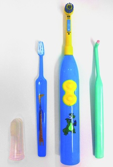 Rodiče čistí svým dětem zuby dvakrát denně (ráno a večer) nejprve prstovým kartáčkem (tzv. „prsťáčkem“, obr. 2) či malým zubním kartáčkem. Po prořezání prvních dočasných stoliček (přibližně ve druhém roce života) čistí dítěti chrup měkkým zubním kartáčkem s velikostí hlavičky podle věku dítěte nebo jednosvazkovým kartáčkem. Provádění ústní hygieny lze dětem zpestřit i zakoupením elektrických kartáčků, kterých je na našem trhu nepřeberné množství. Čištění zubů se pak stává zábavou a hrou, nikoli povinností. Dvouleté až tříleté dítě používá zubní kartáček jako hračku a není schopno si zuby samo správně vyčistit, a tak je odkázáno na pomoc a aktivní spoluúčast svých rodičů. Je vhodné disponovat dvěma dětskými zubními kartáčky: jedním čistí rodiče (výměna kartáčku jednou za dva měsíce) a druhým se učí děti čistit své zuby samy (kartáček má spíše didaktický smysl a děti ho většinou brzy zničí).