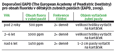 Od šesti měsíců věku dítěte začínáme používat dětskou zubní pastu s obsahem fluoru do 500 ppm v množství o velikosti „hrášku“ (EAPD, 2009). Od dvou let pak zubní pasty s obsahem fluoru do 1000 ppm, množství odpovídá velikosti „hrášku“ (EAPD, 2009). U dětí mladšího školního věku (6–12 let) pokrývá zubní pasta dvě třetiny pracovní části kartáčku a obsahuje 1450 ppm fluoru (EAPD, 2009). Přísun fluoridů lze podporovat jednou týdně aplikací volně prodejných fluoridových gelů (Chen, Lin, 2009).