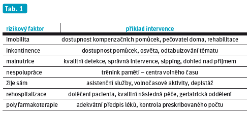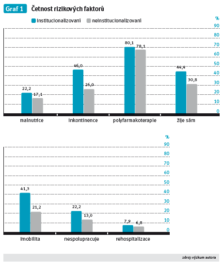 Náš výzkum se zaměřil na vliv sedmi definovaných rizikových faktorů, které determinují častější a dřívější institucionalizaci hospitalizovaných seniorů. Podle českých i zahraničních autorů jsou těmito faktory imobilita (komplikované fraktury, vznik dekubitů, hypostatická pneumonie…), malnutrice (zhoršení soběstačnosti, nehojící se rány…), rehospitalizace (zhoršení kognitivních funkcí, hospitalismus…), žije-li senior sám (absence sociálních kontaktů vedoucí k depresím…), nespolupráce (demence a nemožnost žít doma…), inkontinence moči (větší potřeba ošetřovatelské péče, sociální izolace, poruchy kožní integrity…) a polyfarmakoterapie (nežádoucí účinky polypragmazie…).