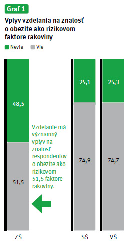 Zhodnotením sledovaných faktorov na vedomostnú úroveň sme zistili nasledujúce závislosti: pohlavie, vek, bydlisko, ani mesačný finančný príjem nemali významný vplyv na úroveň vedomosti o obezite ako riziku rakoviny. Takisto ani BMI a ani onkologické ochorenie respondentov v období vykonávaného prieskumu ani prekonané v minulosti významne neovplyvňovalo sledovanú úroveň znalosti. Jediným sledovaným faktorom, ktorý významne ovplyvňoval úroveň sledovanej vedomosti, bolo vzdelanie. O riziku vedelo 74,7 % respondentov s ukončeným VŠ vzdelaním a 74,9 % s ukončeným SŠ vzdelaním, ale len 51,5 % s ukončeným ZŠ vzdelaním. Rozdiel vo vzdelanostnej úrovni medzi respondentmi s ukončeným VŠ a SŠ vzdelaním oproti respondentom s ukončeným ZŠ vzdelaním bol štatisticky významný. Samotný vek nemal významný vplyv na sledovanú znalosť respondentov. Štatisticky významný rozdiel sa však zistil pri súčasnom hodnotení vzdelania a veku respondentov. Najviac o riziku vedeli respondenti s ukončeným SŠ a VŠ vzdelaním starší ako 70 rokov. Najmenej o riziku vedeli respondenti s ukončeným ZŠ vzdelaním, a to bez ohľadu na ich vek.