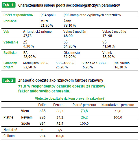 Z celkového počtu 934 respondentov 864 odpovedalo na základnú uvedenú otázku o danej znalosti. Z nich 638 označilo obezitu za rizikový faktor nádorového ochorenia. (Vie: 638; 73,8 %) a 226 uviedlo, že im daný vzťah nie je známy (Nevie: 226; 26,2 %). Celkové percento správnych odpovedí bolo pomerne prekvapivo vysoké. Predpokladali sme skôr o 15–20 % nižšiu vedomostnú úroveň. Podobný prieskum, avšak s podstatne početnejším zastúpením respondentov, ktorý robili a v roku 2012 publikovali v USA , bola takáto vedomosť na úrovni 50 % respondentov. Vyššiu vedomostnú úroveň v našom prieskume si vysvetľujeme: (a) nižším početným zastúpením respondentov so ZŠ vzdelaním; (b) vyšším zastúpením mladšej generácie respondentov s vyšším vzdelaním a s pochopiteľným lepším všeobecným prehľadom vrátane otázok, ktoré sa týkajú aktívneho životného štýlu a prevencie civilizačných ochorení; (c) pomerne veľkým zastúpením onkologicky chorých respondentov s predpokladom väčšieho cieleného záujmu o danú problematiku; (d) svoju úlohu mohol zohrať aj konkrétny charakter zadávaných otázok.