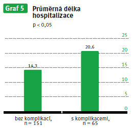 Nyní jsme sečetli kontrolní a sledovanou skupinu se zaměřením na vyčíslení hodnot při komplikacích. Hospitalizace bez komplikací se týkala 151 pacientů a s komplikacemi 65 pacientů.