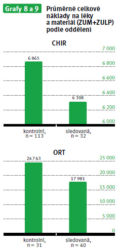 Průměrné náklady na léky a materiál na chirurgii byly v kontrolní skupině 6865 Kč a počet pacientů 113, oproti průměrným nákladům na léky a materiál u oddělení ortopedie v částce 24 743 Kč u 31 pacientů. Tudíž celkové náklady na ZUM+ZULP u kontrolní skupiny byly stlačeny nízkými náklady na chirurgii a velkým počtem kontrolních chirurgických pacientů a celkově dělaly v průměru 6663 Kč.