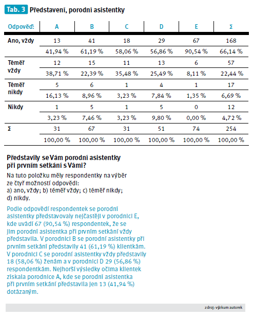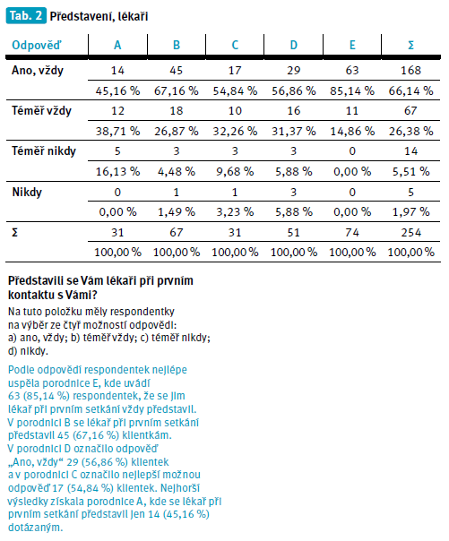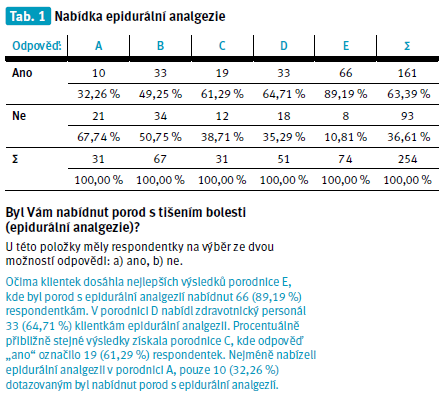 V porodnici A byly loňské výsledky téměř srovnatelné s předchozím hodnoceným obdobím. Klientky identifikovaly stejné slabé stránky. Aktuální výsledky dokazují, že se zlepšila četnost představování personálu při prvním kontaktu s klientkami. V porodnici B jsou klientky stále nejvíce spokojeny s péčí porodních asistentek na porodním sále a porodnici chválí za lidský přístup personálu. Porodnice C se zapojila do společného projektu později, a proto jsou aktuální výsledky prvním výstupem, na základě kterých se navrhnou následná opatření. Porodnici D hodnotily klientky velmi kladně po všech stránkách i přes velmi přísná kritéria (90 % odpovědí ano a spíše ano). Těsně pod 90 % spokojenosti získala tato porodnice pouze v otázce ohledně nabízení epidurální analgezie. Stále viditelné rezervy v představování personálu klientkám jsou v porodnici E.