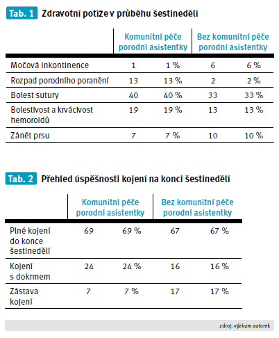 Porodní asistentky včasně a precizně rozpoznávaly poruchy hojení porodních poranění. U 13 % žen s komunitní péčí v šestinedělí odhalily porodní asistentky poruchy hojení porodního poranění. Ve druhé skupině, která neměla komunitní péči porodních asistentek v šestinedělí, ženy uvedly, že u nich došlo k rozpadu porodního poranění ve 2 %. Domníváme se, že takto nízká incidence vychází proto, že ženy uvedly jen evidentně rozpadlé porodní poranění. Přínos péče porodních asistentek také spatřujeme v časné péči o zánětlivé procesy v prsu v období laktace a v nápravě poruch kontinence moče (viz tabulku). Ženy, které měly komunitní péči porodních asistentek, musely v průběhu šestinedělí vyhledat lékařskou pomoc třikrát (3 %). Ženy, které tuto komunitní péči neměly, musely vyhledat lékařskou pomoc jedenáctkrát (11 %) a tři další ženy svůj zdravotní stav telefonicky s lékařem konzultovaly.