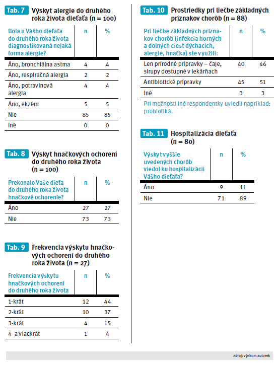 „Výlučné dojčenie po dobu 6 mesiacov znižuje gastrointestinálne infekcie, riziko ďalších infekcií, alergických ochorení, obezity a problém so zubným kazom.“ (Kramer, Kakuma, 2012). V prieskume sme sa zaoberali vplyvom dĺžky dojčenia na chorobnosť dieťaťa do dvoch rokov veku života (infekcie horných a dolných ciest dýchacích, alergie, hnačky). Skúmali sme frekvenciu výskytu chorobnosti s ohľadom na faktor dĺžky dojčenia. Použili sme chí-kvadrát test ako jednu z vhodných metód kategoriálnej analýzy. Pri analýze výsledkov boli respondentky rozdelené podľa dĺžky dojčenia na dve skupiny: 1. matky, ktoré dojčili do prvého roku života dieťaťa; 2. matky, ktoré dojčili viac ako jeden rok.
