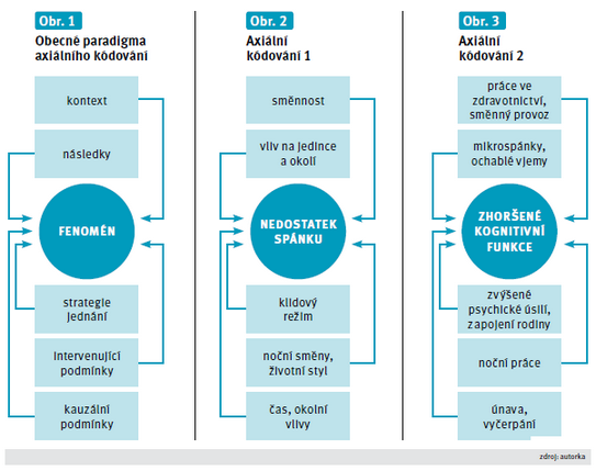 Při zjišťování, zda sestry pociťují spánkový deficit, vzniklo otevřeným kódováním několik základních témat. Směnný provoz, čas, okolní vlivy, vliv nedostatku spánku na jedince a jeho okolí. Při využití axiálního kódování bylo poté možné nalézt příčiny, důsledky, podmínky, interakce, strategie a procesy, které spolu souvisejí (viz obr. 2).