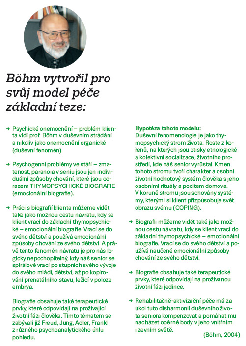 Prof. Böhm ve svém modelu péče zdůrazňuje nutnost uvědomit si, že starý člověk má nejen tělo, ale i duši a emoce, která vystupují do popředí právě ve vyšším věku a vyžaduje zcela specifický přístup v péči. Nestačí totiž jen pečovat o tělo a patologické symptomy, ale po změně úhlu pohledu na péči se odklonit od deficitů v sebepéči k ještě zachovalým schopnostem a dovednostem seniora, které jsou maximálně využity k podpoře sebepéče.
