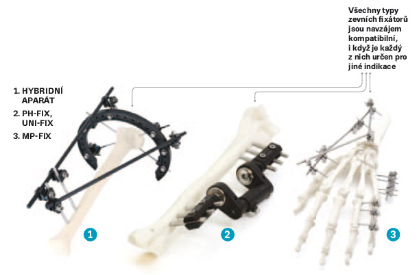 Co znamená, když se řekne zevní nebo externí fixátor? Je to pomůcka či zařízení, které slouží k léčbě komplikovaných či infikovaných zlomenin a které je umístěno vně lidského těla. Používá se po dobu několika týdnů a jeho výhodou je hlavně to, že umožnuje průběžné ošetřování zraněného místa a pacient je přitom plně mobilní již po několika dnech. Zároveň umožňuje ošetřujícímu lékaři provést repozici kostních úlomků při operaci i případně během rekonvalescence.