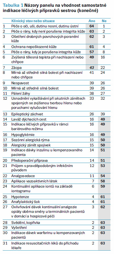 Jak ukazují četnosti souhlasu a nesouhlasu (které jsou komplementární, tj. každý člen panelu se vyjádřil ke každé z klinických situací nebo stavů buď kladně, či záporně) v tabulce 1, šest nově přidaných klinických stavů nebo situací se „v žebříčku“ vhodnosti příliš neprosadilo, všechny zůstaly mezi posledními deseti položkami. Současně se ukázalo, že v konečném hodnocení vhodnosti k samostatné indikaci byl panel velmi opatrný, takže na posledních 18 klinických stavech a situacích, označených v tabulce (14)–(31) s tučně vyznačenými číslicemi (na šedém podkladu) ve sloupci NE, se minimálně ze tří čtvrtin shodl jako na stavech a situacích k samostatné indikaci sestrou nevhodných. Naopak o prvních sedmi z 31 klinických situací nebo stavů, uvedených pod (1)–(7), se panel vyjádřil s významnou názorovou shodou minimálně tří čtvrtin (je-li číslice kurzivou, tak minimálně dvou třetin) jako o situacích a stavech k samostatné indikaci vhodných (tučně vyznačené číslice ve sloupci ANO na šedém podkladu). U položek (1)–(4) se stran vhodnosti dokonce panel shodl téměř z cca 95 %. U následujících položek pak četnosti nesouhlasu již zřetelně narůstají.