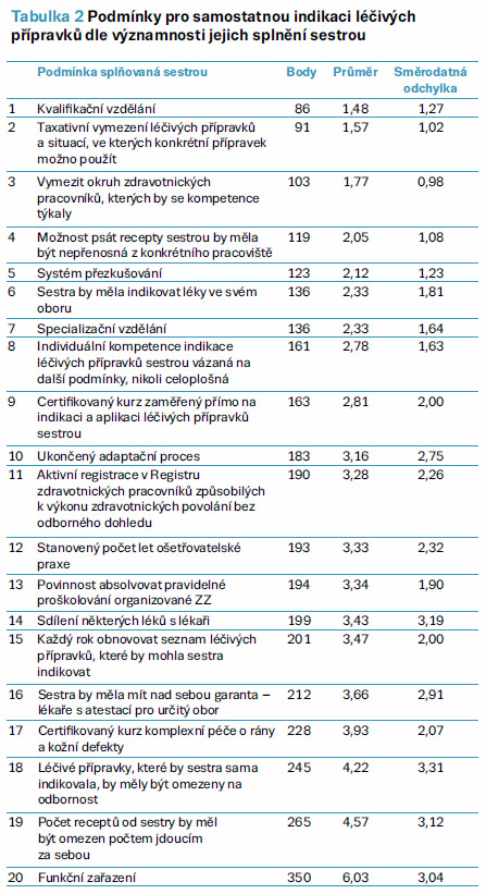 Tak vznikl seznam 20 podmínek, který byl panelu zpětně předložen s instrukcí, aby každou z podmínek obodoval, do jaké míry je významné, aby sestra příslušnou podmínku splňovala. Respondenti měli pro hodnocení podmínek k dispozici bodový rozsah 1–10, kde 1 = podmínka nejvýznamnější a 10 = podmínka nejméně významná (hodnoty nacházející se mezi 1 až 10 nebyly záměrně verbalizovány). Soubor podmínek ohodnocený panelem, který aktuálně tvořilo 58 účastníků, obsahuje tabulka 2.