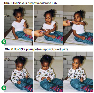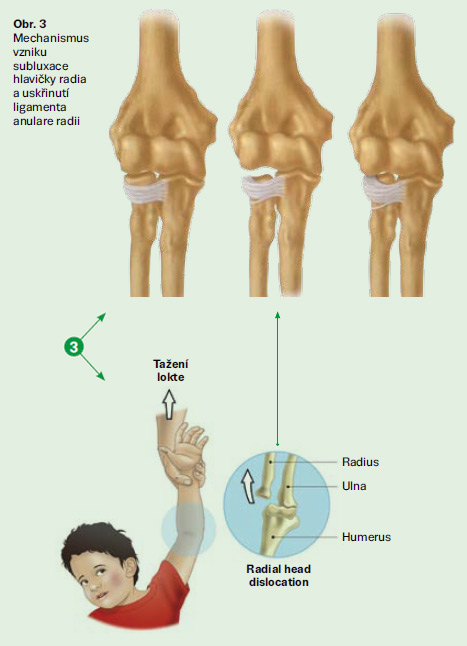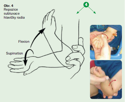 - dítě bolestivě reaguje na pokus o pohyb v lokti, bolest je soustředěna okolo hlavičky radia
