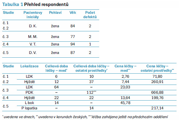 Výzkumu předcházelo nastavení metodologie, získání souhlasu vedení nemocnice, souhlasného stanoviska etické komise nemocnice ve Slaném a v neposlední řadě souhlasů samotných pacientů. Výzkum trval tři měsíce. Během této doby jsme zdokumentovali hojení defektů celkem u čtyř pacientů (tabulka 1). Šetření proběhlo na Oddělení ošetřovatelské péče v nemocnici ve Slaném.