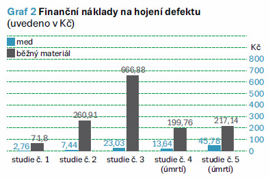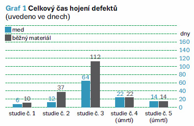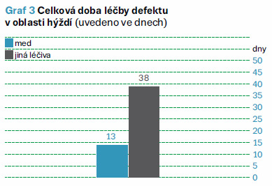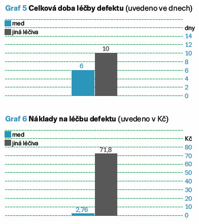 Po skončení léčby jsme porovnali délku hojení u obou použitých prostředků. Výsledky byly velmi příznivé. Ve třech případech došlo k rychlejšímu hojení při použití medu (graf 1). Hojení proběhlo bez komplikací. Ani v jednom případě nebylo nutné přistoupit k léčbě antibiotiky. Ani v jednom případě nebyla doba hojení pomocí medu delší než při použití běžných obvazových materiálů. Ve dvou případech ke zhojení nedošlo a sledování bylo ukončeno, neboť během studie došlo ke zhoršení zdravotního stavu a úmrtí pacienta. Ani v jednom z těchto dvou případů pacientek nedošlo ke komplikacím v souvislosti s chronickým kožním defektem a úmrtí byla v jiných příčinných souvislostech. Velmi ilustrativní byl případ pacientky po amputaci palců na dolních končetinách. Pacientka byla nejprve léčena na chirurgickém oddělení a k nám přeložena až po amputaci druhého palce. Vzhledem k tomu, že jsme znali data amputací, bylo možné vypočítat délku léčby pomocí medu a jiných prostředků. Léčba pomocí medu byla v tomto případě kratší o 48 dní, což mělo velmi příznivý účinek na psychiku pacientky. Tento výsledek v délce hojení defektu byl nejvýraznější. Ve všech sledovaných případech byla léčba pomocí medu mnohonásobně levnější (graf 2). Finanční položky vynaložené na med jsou v současných podmínkách našeho zdravotnictví zanedbatelné.