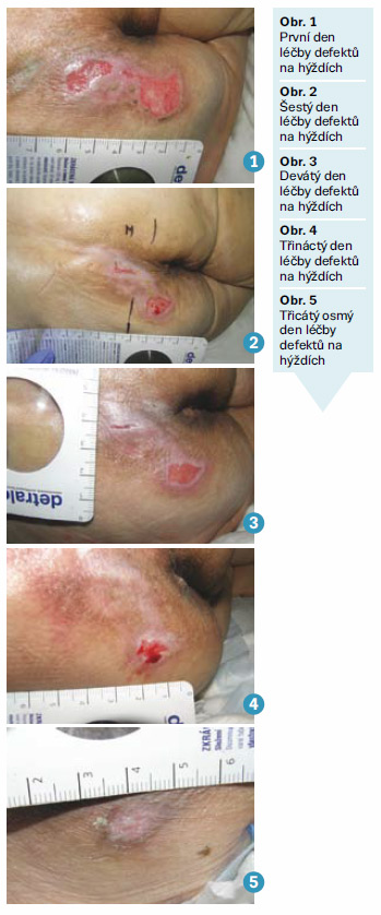 Dva defekty lokalizovány v oblasti hýždí. Průběh hojení je ilustrován na fotografiích 1–5 (graf 3 a 4, fotografie 1–5).