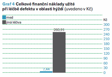 V průběhu studie bylo sledováno množství medu i ostatních léčebných přípravků aplikovaných na ránu, abychom mohli porovnat též cenu léčby. Ostatní obvazový materiál (mulové čtverce, mastný tyl, náplast, obinadlo) byl používán v obou případech stejně. V číselné kalkulaci se jejich cena nepromítne.