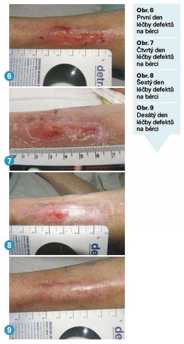 Levá noha – pacientka si opakovaně sedřela kůži na holeni levé nohy. Než se podařilo defekt zhojit, došlo opakovaně ke zranění, přestože byl defekt obvazován.