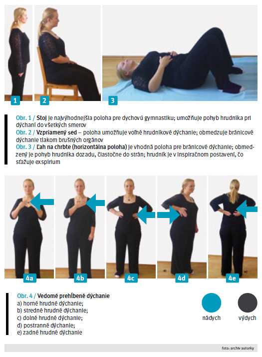 Súhrn: Dýchanie je jeden zo základných a najvýznamnejších pohybových stereotypov, pri ktorom je zaisťovaná výmena plynov (kyslíka a oxidu uhličitého) medzi vonkajším a vnútorným prostredím. Je to prirodzený a životne nevyhnutný automatizmus, ktorý si človek neuvedomuje, pokiaľ sa mu nezačne zle dýchať. Význam dychovej gymnastiky skúmali viacerí svetoví odborníci Slader et al., 2006; Hitti, 2006; Gomieiro et al., 2011; Laurino et al. 2012. Výsledky štúdií ukázali, že pravidelne realizovaná dychová gymnastika vedie k redukcii užívania úľavových liekov i inhalačných kortikosteroidov, k zvýšeniu svalovej sily a k zlepšeniu dýchania. Program reedukácie dýchania zredukoval panické príznaky a agorafóbiu pacientov.