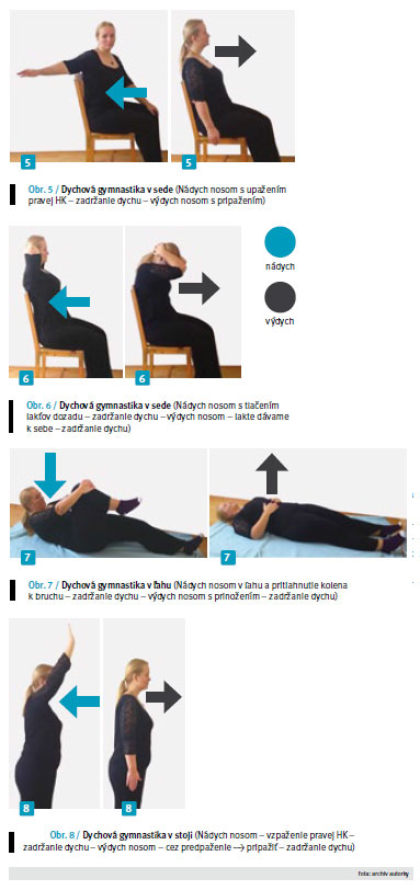 - na konci výdychu je trojsekundová výdychová pauza a krátke zotrvanie v konečnej polohe pohybu (obr. 5–8),