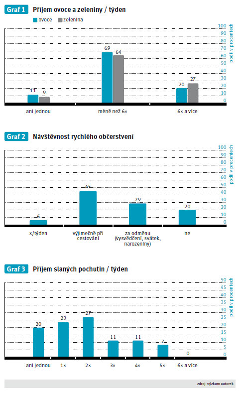 Konzumace zeleniny a ovoce představuje důležitý příjem vitaminů, zejména vitaminu C, provitaminu A a kyseliny listové, minerálních a dalších nutričně významných látek – antioxidanty, vláknina aj. Pařízková, Lisá a kol. uvádějí denní doporučenou dávku zeleniny 3–4 porce, ovoce 2 porce (5). Jak odpovídali respondenti našeho šetření, je zřejmé z grafu 1. Překvapivě pozitivně vyznívá, že návštěvnost rychlých občerstvení není u dětí pravidelná, konkrétní výsledky uvádí graf 2. Porovnáme-li naše hodnoty opět s výzkumným šetřením Dajčarové, zjišťujeme, že jsou o 19 % nižší. Jedním z důvodů odlišných výsledků může být rozdílnost respondentů, dále ale i fakt, že se díky celosvětové osvětě stravovací zvyklosti skutečně mění. Každopádně vždy záleží na postoji rodičů, zda dokáží dítě dostatečně pádnými argumenty přesvědčit o nevhodnosti tohoto stravování pro jeho zdravý vývoj.