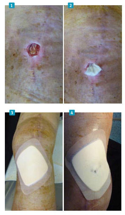 Pacientka ve věku 72 let podstoupila náhradu levého kolenního kloubu endoprotézou. Operační rána se komplikovala infekcí a dehiscencí v distální části rány. Pacientka byla diabetička II. typu na PAD i inzulinoterapii, dále trpěla hypertenzí, ICHS, nefropatií a polyneuropatií. Při objektivním vyšetření se jedná o dehiscenci v distální části jizvy, velikosti 1,5 × 2 cm, hloubka 5 cm. Na spodině rány byla přítomna blátivá nekróza a povlaky, implantát nebyl obnažen. Rána se vyznačovala výraznou exsudací. Indurace, retence či fluktuace nebyla přítomna (obr. 1–3). Výsledkem kultivace byl Staphylococcus aureus s citlivostí na ciprofloxaciny, které pacientka také užívala dle doporučení ošetřujícího ortopeda. V rámci ošetření byl do rány přiložen obklad s oplachovým roztokem na 15 min. a následně byl přiložen Hydrofiber® se stříbrem (Aquacel® Ag+ Extra), jako sekundární krytí jsme volili Aquacel® Foam. Pacientka docházela pravidelně obden na převazy na chirurgickou ambulanci. Během převazu byl prováděn debridement rány a postupně byly odstraněny nekrotické tkáně a povlaky. Rána postupně granulovala z hloubky. Kontrolní stěr z rány za tři týdny byl negativní. ATB terapie byla ukončena a pacientka byla postupně dohojena krytím Aquacel® Ag+ Extra.
