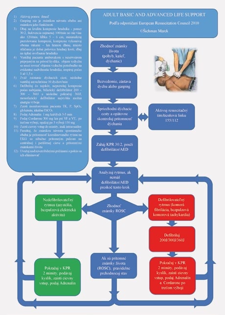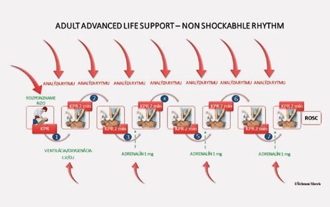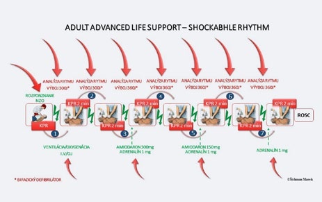V súčasnosti existujú odlišné algoritmy pre defibrilovateľné a pre nedefibrilovateľné poruchy rytmov. Vo všeobecnosti platí, že každý cyklus je rovnako dlhý, s dvojminútovým vykonávaním kompresií hrudníka a umelého dýchania pred analýzou rytmu, adrenalín sa podáva v 3–5-minútových intervaloch až do obnovenia obehu, pričom pri nedefibrilovateľnej poruche rytmu sa podáva ihneď po zaistení cievneho vstupu a pri defibrilovateľnej poruche rytmu sa podáva po 3. výboji spolu s amiodaronom. V rámci oxygenoterapie sa odporúča podávanie v úvode zastavenia obehu kyslíka s prietokom 15 l/min, čím je možné dosiahnuť až 85% inspiračnú frakciu kyslíka, pričom po návrate spontánneho obehu je potrebné podávať kyslík tak, aby SpO2 bola udržiavaná v rozmedzí 94–98 %. Ak nie sme schopní zaistiť intravenózny vstup do 2 minút alebo ak boli naše tri pokusy neúspešné, je potrebné zaistiť intraoseálny vstup. V rámci názorného zobrazenia jednotlivých intervencií pri náhlom zastavení obehu u dospelého pacienta sme vypracovali poster Basic and Advanced Life Support a grafické znázornenie jednotlivých krokov kardiopulmonálnej resuscitácie pri defibrilovateľnej poruche rytmu a pri nedefibrilovateľnej poruche rytmu.