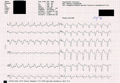 Dle standardních postupů je pacientka uložena na expektační lůžko, jsou monitorovány základní životní funkce – GCS, kontinuální třísvodové EKG, TK, P, SpO2, D, následně je točeno dvanáctisvodové EKG – s kompletní blokádou levého Tawarova raménka. Na základě indikace lékaře je zaveden periferní žilní katetr (20 G), odebrána krev (urea, kreatinin, jaterní soubor, ionty, CRP, glykémie, krevní obraz, D-dimer – k vyloučení tromboembolické nemoci). Pro přetrvávající dušnost a nízké hodnoty saturace (84 %) je zahájena oxygenoterapie kyslíkovou maskou, a to 4 litry/min. Tlak krevní 118/70 mm Hg, tepová frekvence 102/minutu.