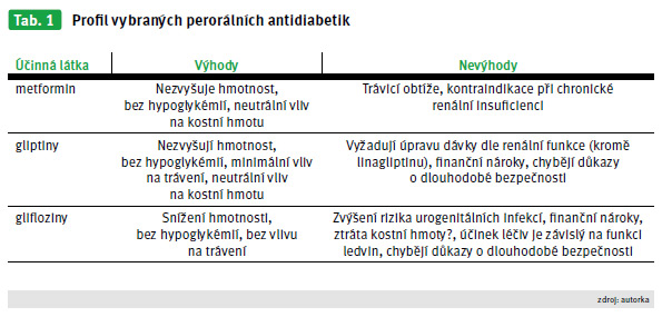 V terapii diabetes mellitus 2. typu zůstává metformin lékem první volby. Před nástupem nové generace léků, „inkretinových mimetik, gliptinů a gliflozinů“, bylo možné kombinovat metformin pouze s deriváty sulfonylurey, akarbózou a glinidy, inzulinovými senzitizéry a inzulinem. Gliptiny jsou velmi významné látky, jež působí na novém principu s neutrálním vlivem na hypoglykémii. Jsou to léčiva, která nezvyšují hmotnost. Lze je kombinovat se všemi ostatními perorálními antidiabetiky včetně inzulinu. Ukazuje se jejich pozitivní vliv na výskyt úmrtí na kardiovaskulární příčiny, výskyt infarktů myokardu a cévních mozkových příhod. Glifloziny neboli glukuretika jsou léčiva, která zbavují organismus nadbytečné glukózy prostřednictvím ledvin. Jejich nespornou výhodou je snížení hmotnosti a tlaku. Určitou limitací může být zvýšené riziko urogenitálních infekcí, a to častěji u žen, a ovlivnění jejich funkce stavem glomerulární filtrace. Souhrn základních výhod a nevýhod nových molekul najdete v tab. 1 Profil vybraných perorálních antidiabetik (Abrahamson M et al., 2013).