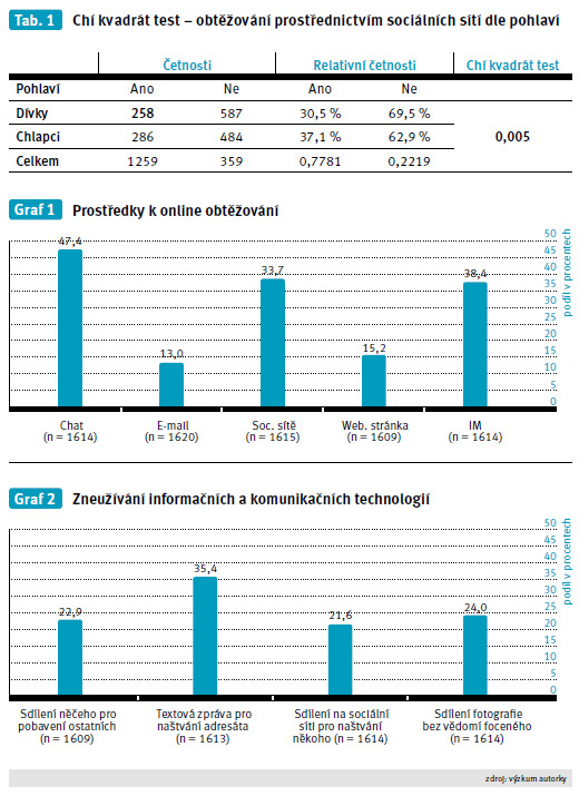 Při srovnání míry obtěžování prostřednictvím sociálních sítí se ukázalo, že jsou obtěžovány více dívky (37,1 %) než chlapci (30,5 %). To potvrdil i chí kvadrát test, kdy byla testována hypotéza na hladině významnosti α = 0,05. Naměřená hladina významnosti byla p = 0,005 (tab. 1). Jak uvádějí Černá et al. (2013), dívky se na internetu věnují spíše sociálním aktivitám (čtou, píší, přispívají do diskuzí a podobně), zatímco chlapci více například hrají hry. Tento výsledek se proto dal předpokládat.