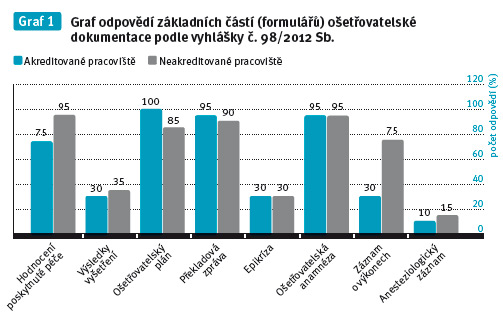 Dále jsme zjistily, že respondentky z neakreditovaného pracoviště mají větší přehled o tom, z jakých částí by se měla ošetřovatelská dokumentace skládat (dle vyhlášky č. 98/2012 Sb., o zdravotnické dokumentaci). Všechny správné možnosti zaškrtlo na neakreditovaném pracovišti 45 % respondentek a na akreditovaném pracovišti pouze 15 % respondentek (obr. 1).