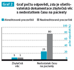 Zbytečnou věc uvedlo na obou pracovištích 5 % respondentek a nedostatek času na péči o pacienta uvedlo v průměru 52 % respondentek (obr. 2).