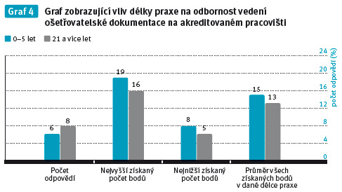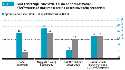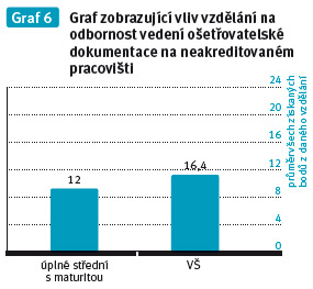 Na neakreditovaném pracovišti vyšlo, že délka praxe nemá vliv na odbornost vedení dokumentace. Z pohledu vzdělání respondentky s VŠ dosáhly v průměru více bodů než respondentky se vzděláním středním s maturitou, tedy je možné říci, že vzdělání tu má vliv na odbornost vedení ošetřovatelské dokumentace (obr. 6).