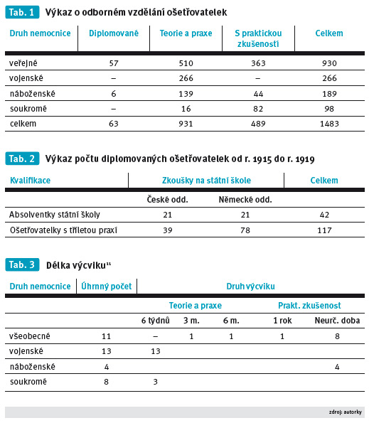 O počátku 20. let minulého století můžeme hovořit jako o vzniku regulace ošetřovatelského vzdělání, byť nikoli regulace profese. Již v roce 1914 [8] bylo uzákoněno, že profesní označení (podle tehdejší terminologie „titul“) „diplomovaná ošetřovatelka“ a pro práci název „sestra“ mohou užívat pouze osoby, které složily státní zkoušky stanovené Zdravotním úřadem při Ministerstvu vnitra na státní škole po absolvování státní ošetřovatelské školy nebo které se na této škole podrobily státním zkouškám po prokázané nejméně tříleté praxi. Možnost složit státní zkoušku pro sestry z praxe však byla pouze přechodného charakteru – možnost připuštění ke zkoušce byla pouze pro ty praktické ošetřovatelky, které požadovanou praxi dokončily před 30. prosincem 1919. Právě zde nalezneme odpověď na otázku, jak byl možný takový rozmach ošetřovatelství při poměrně malém počtu ošetřovatelských škol (respektive po určitou dobu pouze jedné školy). Autoři citované publikace zpracovali podrobný výzkum vzdělání ošetřovatelek všech pražských nemocnic, kde v září roku 1919 sloužilo 1483 ošetřovatelek. Kromě nich působily v té době v Praze dvě organizace vysílající ošetřovatelky do rodin: Český spolek diakonek s dvaceti ošetřovatelkami zaměstnanými v evangelických rodinách a „Milosrdné sestry“ – organizace osmnácti ošetřovatelek bez náboženských omezení. [9] Kvalifikační složení pražských ošetřovatelek je uvedeno v tab. 1. Diplomované ošetřovatelky byly charakterizovány výše. Jejich celostátní počet je uveden v tab. 2. a délka jejich výcviku je uvedena v tab. 3.