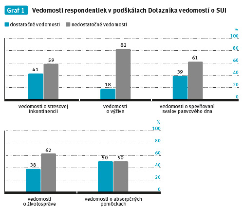 Stresová inkontinencia moču (stres urinary incontinence – ďalej SUI) postihuje najmä ženy. Podľa štatistiky v Českej republike trpí inkontinenciou asi 510 000 žien (Vrublová, Holisová, 2011). Švihra J. a kol. (2001) v epidemiologickej štúdii zo Slovenska uvádzajú, že asi 530 tisíc žien trpí inkontinenciou moču, z toho 49–50 % má SUI. Pri skúmanej informovanosti o SUI sme zistili, že 59 % respondentiek malo nedostatočné vedomosti o stresovej inkontinencii, 82 % respondentiek má nedostatočné vedomosti o výžive, 62 % respondentiek o spevňovaní svalov panvového dna, 62 % respondentiek o životospráve a 50 % respondentiek o absorpčných pomôckach, ktoré sa používajú pri inkontinencii.