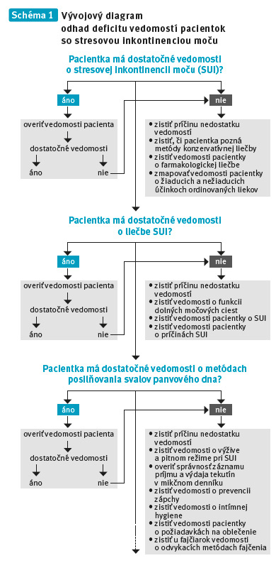 Na základe analýzy výsledkov prieskumu sme si okrem iného stanovili vypracovať vývojový diagram zberu údajov deficitu vedomostí žien so stresovou inkontinenciou moču. Veríme, že uvedená pomôcka pomôže sestrám včas identifikovať nedostatok vedomostí postihnutých žien v klinickej praxi a napomôže ženám riešiť uvedený problém.