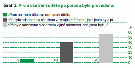 Nejčastější důvod, proč bývají novorozenci od matek odděleni, je poporodní vyšetření miminka. Tato vyšetření mohou ale probíhat přímo na těle matky. Přesto z naší ankety vyplývá, že vyšetření miminka na vlastním těle zažila pouze jedna matka, u 40 % bylo dítě vyšetřeno alespoň ve stejné místnosti a 55 % novorozenců bylo vyšetřováno v jiné místnosti, než byla jeho matka. Naše anketa přinesla pozitivní výsledky, co se týče přístupu lékařů a porodních asistentek, protože 85 % rodiček vypovědělo, že lékař i porodní asistentka respektovali jejich přání ohledně porodu.