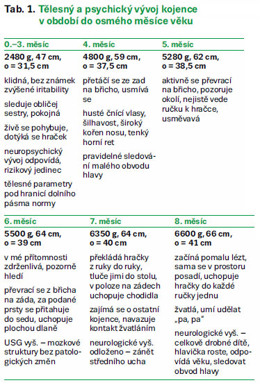 Tabulka 1 zaznamenává vývoj kojence v jednotlivých měsících života, kdy bylo prováděno vlastní pozorování. Dosavadní neuropsychický vývoj v jednotlivých měsících je neuroložkou hodnocen jako odpovídající věku kojence, doposud nebylo diagnostikováno alkoholové poškození jedince. Ačkoli jsou přítomny nízké tělesné parametry, roste kojenec progresivně.
