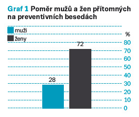 Na základě analýzy všech aspektů jednotlivě sledovaných a hodnocených položek aktuálního zdravotního stavu a hodnot fyziologických funkcí vč. konfrontace se získanými daty z dotazníkového a evaluačního šetření byly získány následující údaje. Do screeningového preventivního šetření se zapojilo celkem 408 osob, z toho bylo 113 mužů a 295 žen (graf 1 – Poměr mužů a žen přítomných na preventivních besedách).