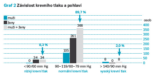 V rámci screeningu krevního tlaku bylo vyšetřeno 408 respondentů. Naměřené hodnoty byly seřazeny do grafu. Téměř 90 % všech respondentů mělo hodnoty krevního tlaku v normě. Pouze 2 % respondentů měla zjištěné vyšší hodnoty krevního tlaku nad 140/90 mm Hg. Všichni tito respondenti byli dle anamnestických údajů hypertonici a jejich krevní tlak byl korigován či dlouhodobě sledován praktickým lékařem. Jednalo se pouze o muže. Průměrná naměřená hodnota krevního tlaku byla 121/74 mm Hg, nejnižší pak 80/50 mm Hg a nejvyšší 165/90 mm Hg. Přehled naměřených hodnot znázorňuje graf 2 – Závislost krevního tlaku a pohlaví.